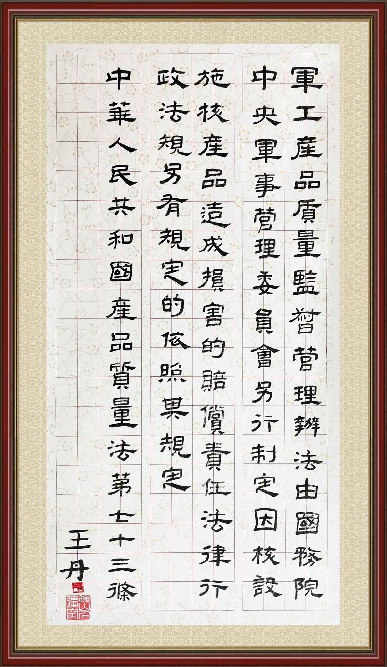 《中華人民共和國產(chǎn)品質(zhì)量法》自1993年9月1日起開始施行,先后進(jìn)行三次修正。作為產(chǎn)品質(zhì)量領(lǐng)域的基本法律,產(chǎn)品質(zhì)量法對規(guī)范產(chǎn)品質(zhì)量管理、維護(hù)消費(fèi)者合法權(quán)益、促進(jìn)經(jīng)濟(jì)社會發(fā)展具有重要意義。為更好地學(xué)習(xí)、宣傳、貫徹這部法律,在國家市場監(jiān)督管理總局法規(guī)司的支持下,法治日報社開展了“‘書·法’系列活動之書寫《中華人民共和國產(chǎn)品質(zhì)量法》”活動。