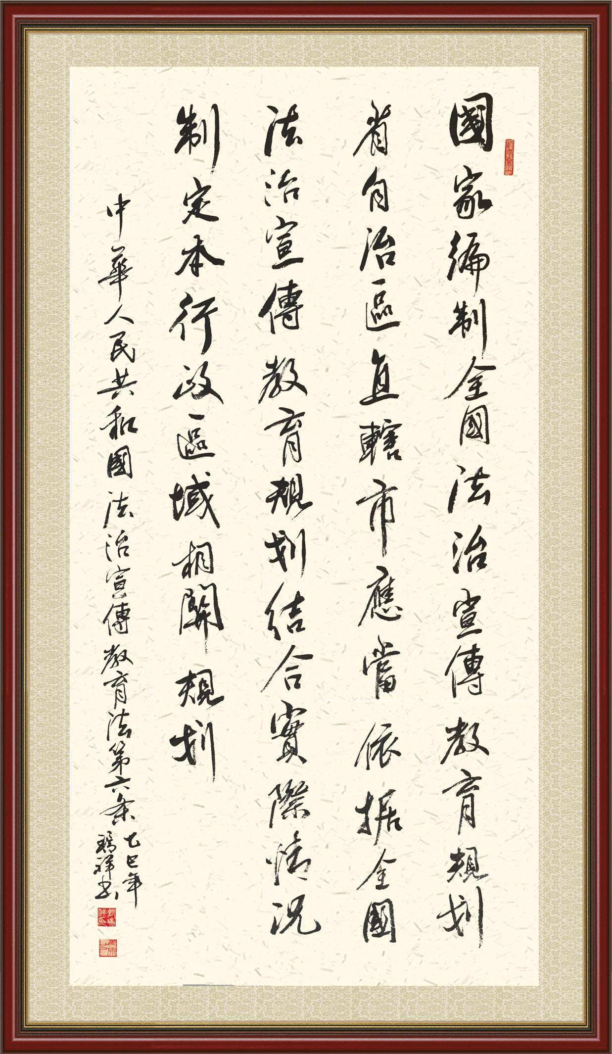 2020年7月11日,由法治日報社主辦的“書·法”系列活動正式啟動,先后書寫《中華人民共和國民法典》《中華人民共和國憲法》《中華人民共和國民營經(jīng)濟促進法》等21部法律法規(guī)。