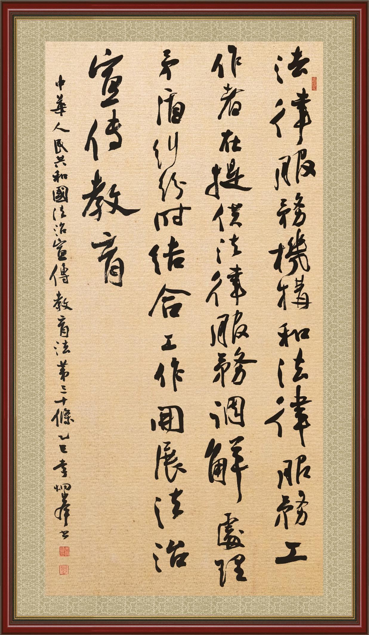 2020年7月11日,由法治日報社主辦的“書·法”系列活動正式啟動,先后書寫《中華人民共和國民法典》《中華人民共和國憲法》《中華人民共和國民營經(jīng)濟(jì)促進(jìn)法》等21部法律法規(guī)。