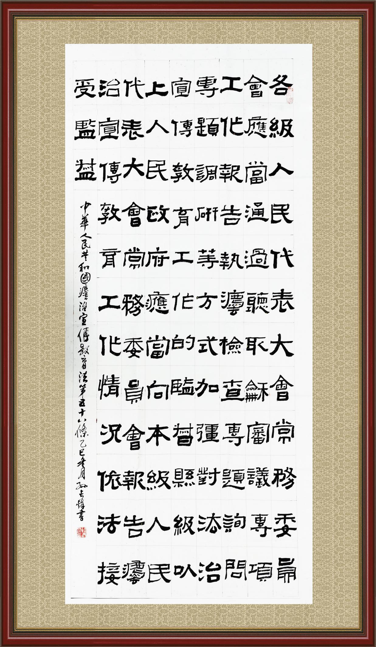 2020年7月11日,由法治日報(bào)社主辦的“書·法”系列活動正式啟動,先后書寫《中華人民共和國民法典》《中華人民共和國憲法》《中華人民共和國民營經(jīng)濟(jì)促進(jìn)法》等21部法律法規(guī)。