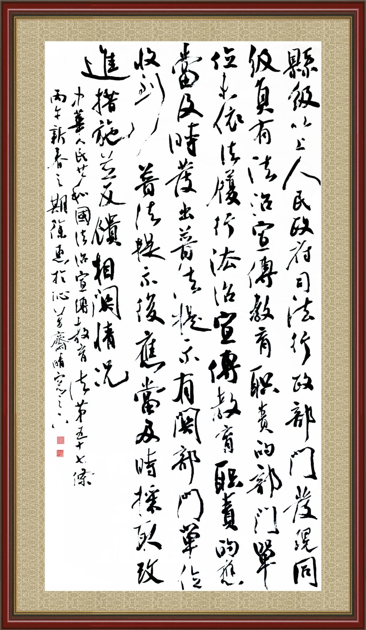 2020年7月11日,由法治日報社主辦的“書·法”系列活動正式啟動,先后書寫《中華人民共和國民法典》《中華人民共和國憲法》《中華人民共和國民營經濟促進法》等21部法律法規(guī)。