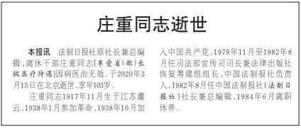 2020年3月27日,《法制日報》2版刊登《莊重同志逝世》消息。