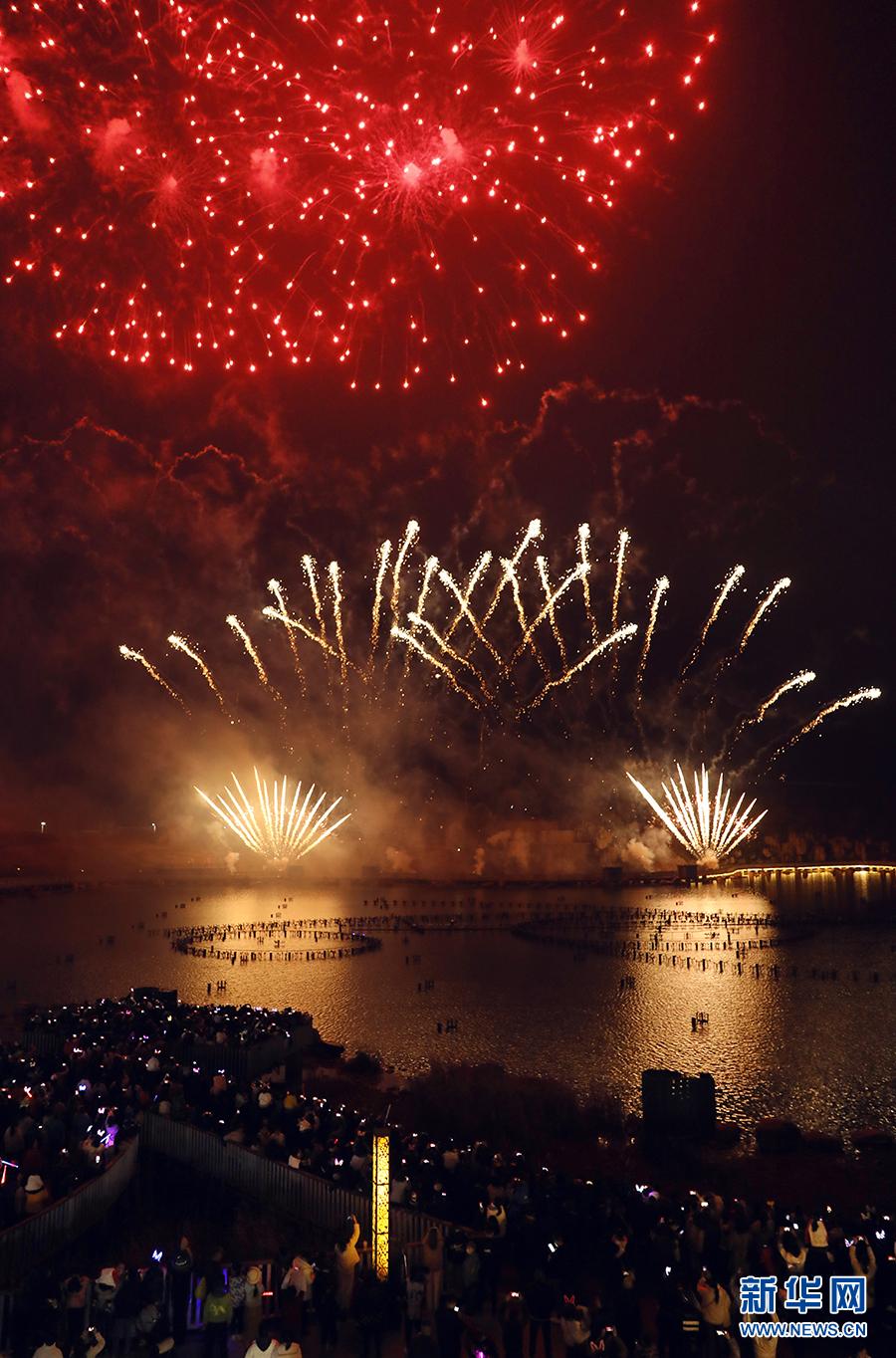 1月31日晚,煙花光影水秀在天河潭景區(qū)上演。新華網(wǎng) 盧志佳 攝