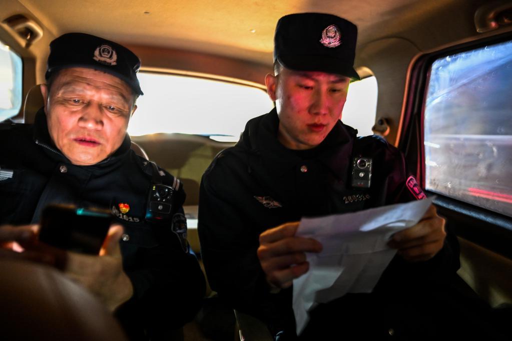2月5日,通遼市奈曼旗公安局大沁他拉派出所民警徐萌(右)和郝新軍在出警途中核對(duì)報(bào)案人信息。