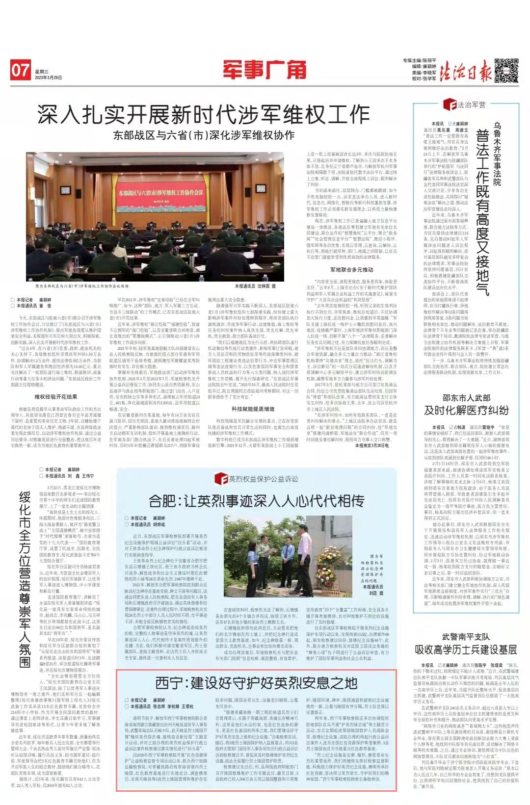 兩年來,西寧軍事檢察院還多次協(xié)調(diào)組織駐地部隊官兵開展“護英烈鑄忠誠”等主題黨日活動,官兵定期輪流幫助陵園管護人員清除雜草、修繕紀念設(shè)施。該院辦理的兩起行政公益訴訟案件入選為全國紅色資源保護典型案例,3縣烈士陵園也成為當?shù)刂攸c紅色教育基地。