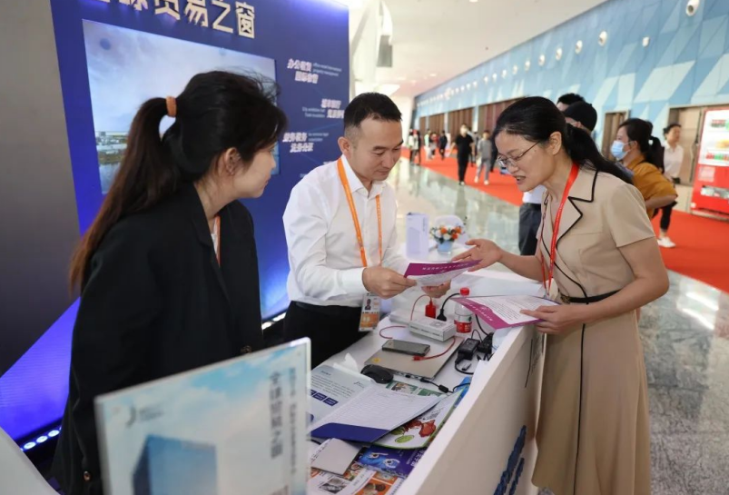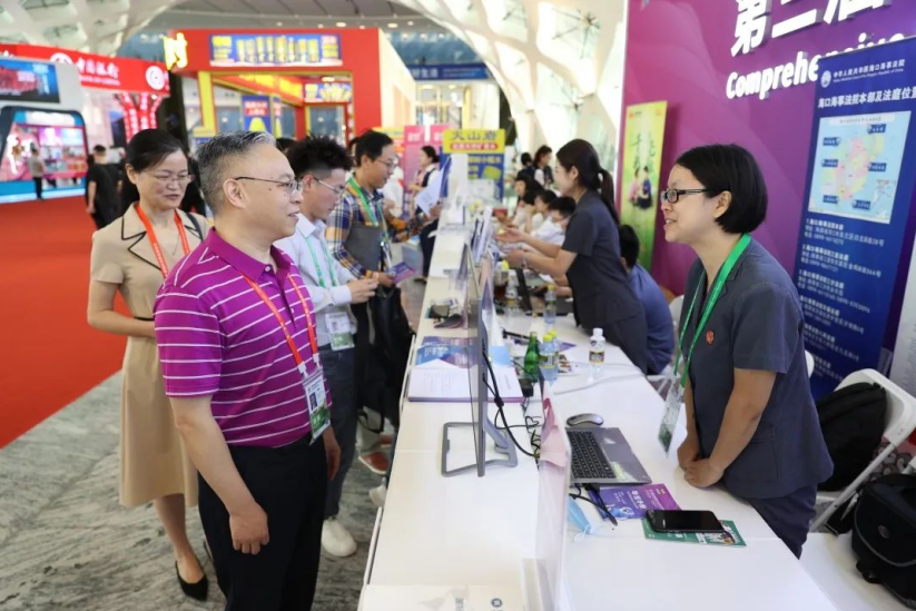 圖為海南一中院法官與參展企業(yè)代表溝通交流。
