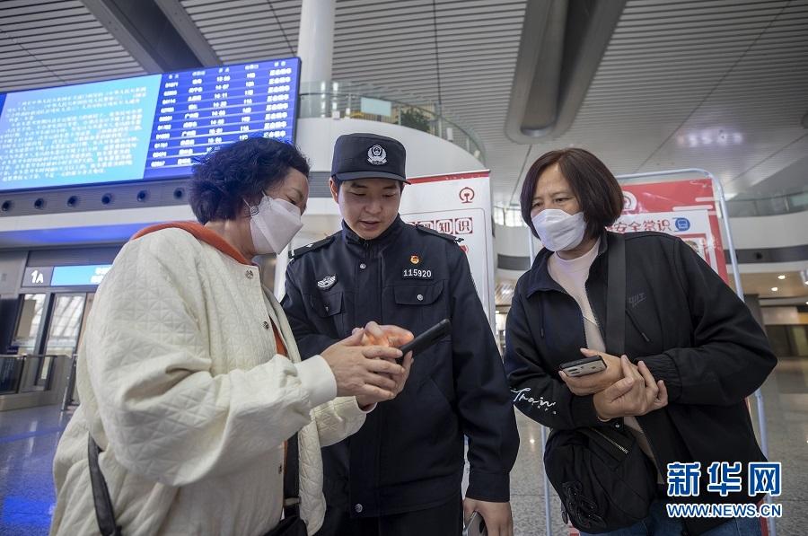 重慶西站候車(chē)廳,鐵路民警向旅客講解如何識(shí)別非法網(wǎng)站。新華網(wǎng)發(fā)(胡勇 攝)