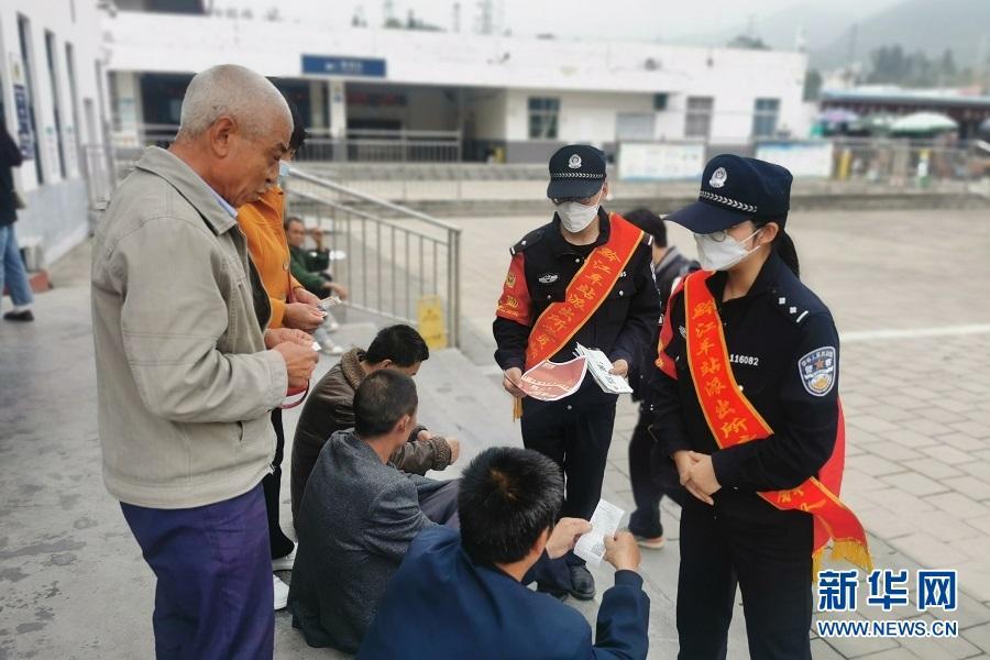 黔江站站前廣場(chǎng),鐵路民警向旅客宣傳國(guó)家安全知識(shí)和防范電信網(wǎng)絡(luò)詐騙常識(shí)。新華網(wǎng)發(fā)(徐玲玲 攝)