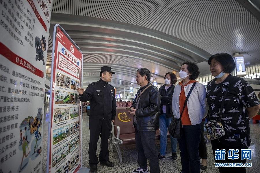 在重慶北站、重慶西站、萬(wàn)州北站等鐵路樞紐車(chē)站,重慶鐵路警方聯(lián)合屬地公安機(jī)關(guān)、車(chē)站管委會(huì)、鐵路企業(yè)等單位,組織民警、職工在站前廣場(chǎng)、候車(chē)大廳等旅客較多的地方,宣講鐵路安全常識(shí)、電信詐騙、反邪教等知識(shí),引導(dǎo)廣大旅客增強(qiáng)國(guó)家安全意識(shí)。