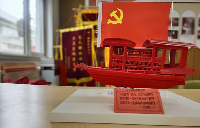 走進(jìn)朝陽(yáng)里社區(qū)的和平區(qū)社區(qū)志愿服務(wù)展館,一艘紅色的小船模型靜靜地??吭谌肟谔幍臅?shū)桌上,小船的上方,懸掛著一面袖珍的黨旗。