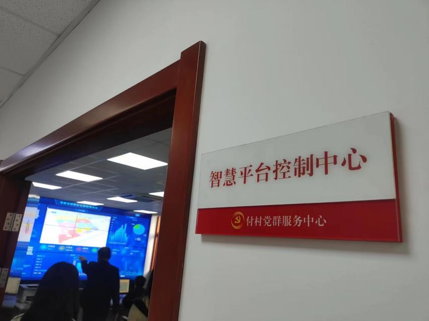 “各位現在看到的就是電腦端的一個界面,屏幕的中間是我們付村的一個平面圖,下面展示的是人口組成……”在付村的智慧平臺控制中心,工作人員站在一塊藍色屏幕前對記者進行講解。