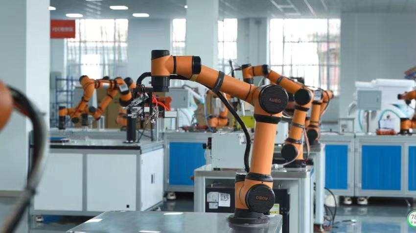 遨博(山東)智能機(jī)器人有限公司的六軸協(xié)作機(jī)器人,正在演示工業(yè)場(chǎng)景中的模塊組裝
