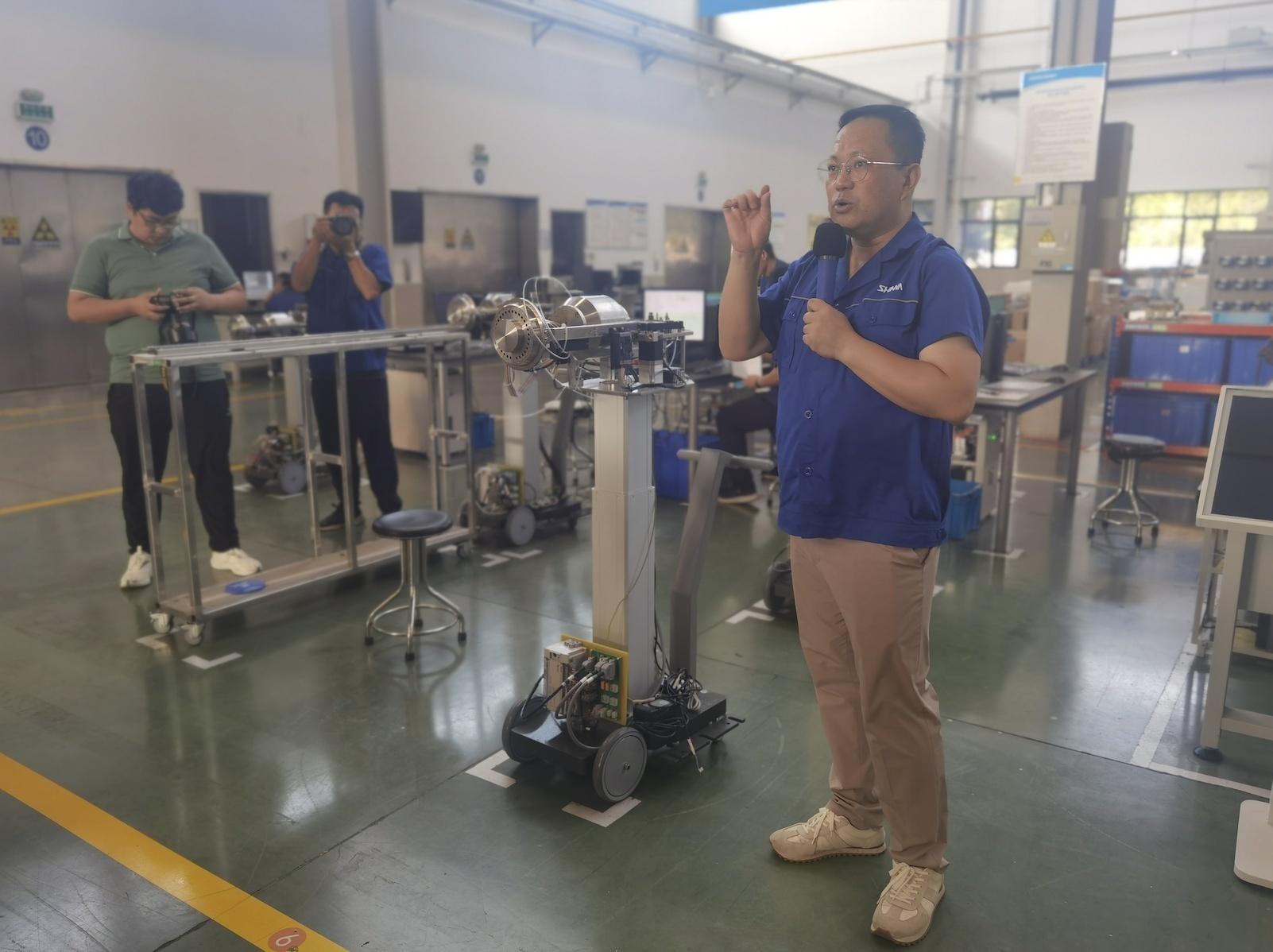 “高質(zhì)量發(fā)展調(diào)研行”采訪團(tuán)來到位于山東淄博市的山東新華醫(yī)療器械股份有限公司調(diào)研,工作人員王波在進(jìn)行講解