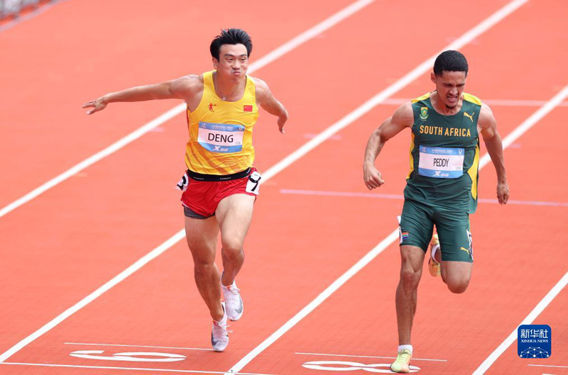 8月1日,中國選手鄧智艦(左)在男子100米預(yù)賽中沖線。最終,他以10秒47的成績晉級半決賽。新華社記者 賈浩成 攝