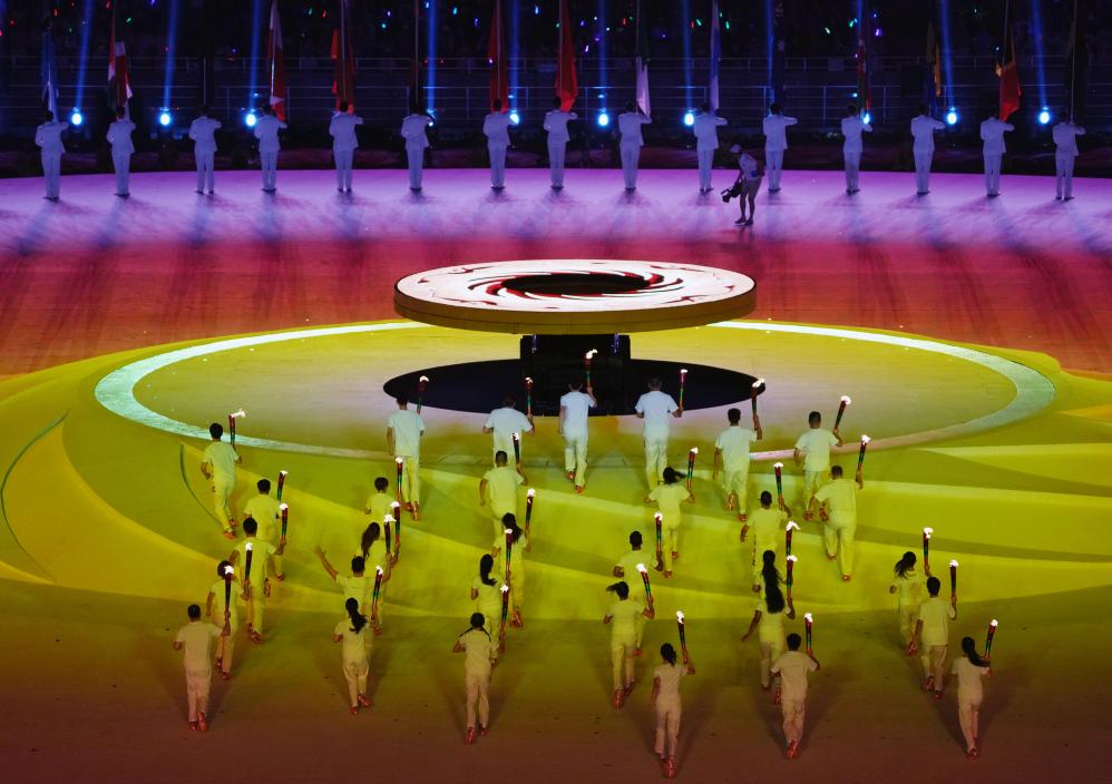 7月28日,火炬手在成都大運會開幕式上入場。新華社記者 李欣 攝