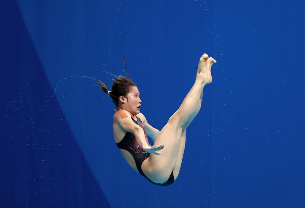 8月7日,中國隊選手王偉瑩在比賽中。當日,在成都大運會混合團體決賽中,中國隊選手黃子淦/王偉瑩以436.45分的總成績獲得冠軍。新華社記者 王翔 攝