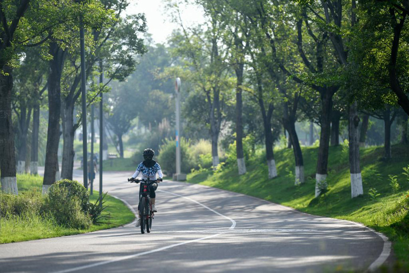7月16日,市民在成都天府綠道騎行。新華社記者 胥冰潔 攝