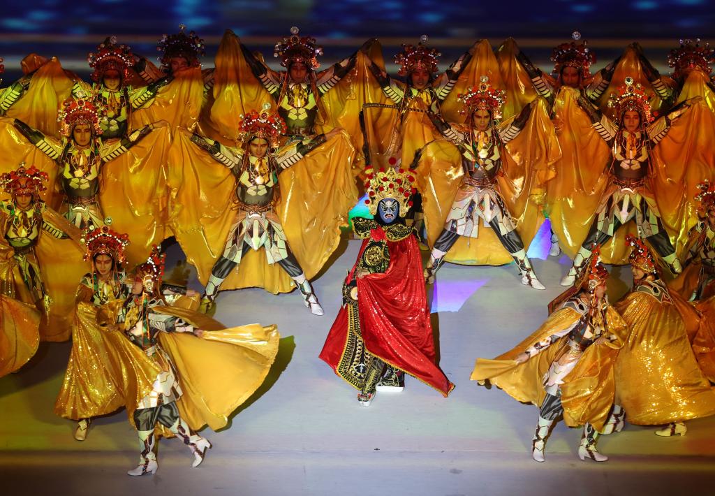 7月28日,演員在大運(yùn)會(huì)開幕式上表演川劇變臉。新華社記者江宏景攝