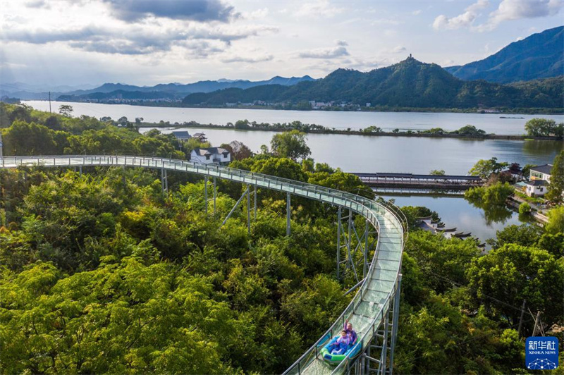 8月19日,游客在三都漁村體驗(yàn)星空水滑道特色項(xiàng)目(無人機(jī)照片)。