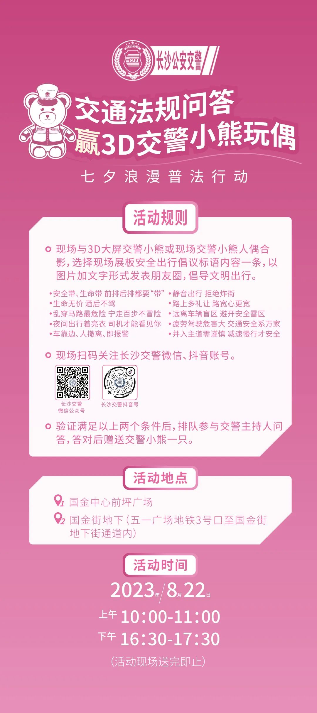 “七夕”當(dāng)天(上午10:00-11:00、下午16:30-17:30),分別在國(guó)金中心前坪和國(guó)金街地下通道大屏前設(shè)置兩個(gè)普法互動(dòng)打卡點(diǎn),開展普法宣教互動(dòng)贈(zèng)送長(zhǎng)沙交警小熊玩偶活動(dòng)。現(xiàn)場(chǎng)民警將開展普法宣傳,邀請(qǐng)市民參與“交通法規(guī)問答贏交警小熊玩偶”活動(dòng), 通過答題和游戲互動(dòng)可獲得“交警小熊”玩偶一只。(注意,是必得哦)