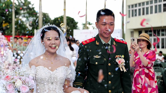 執(zhí)法員邱猛猛的愛人吳佳怡在致辭中說,這次集體婚禮將成為他們生命中最美好最深刻的記憶,同時(shí),她也將繼續(xù)激勵自己的愛人扎根海疆,為祖國作出更大的奉獻(xiàn)。話語樸實(shí)無華但擲地有聲,引起現(xiàn)場所有人共鳴。