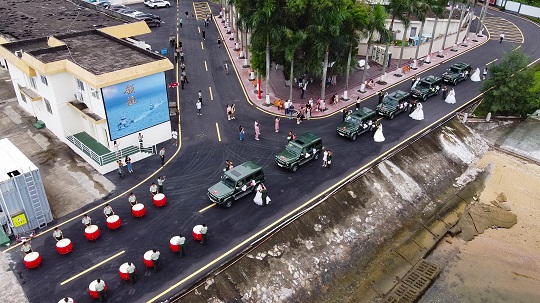 “愛意翻山渡海,終抵良人身畔。今天我們在此,和天空,和海疆,和艦艇一起見證這11對新人人生最重要的時(shí)刻。”隨著愛情的煙花在天空綻放,幸福的汽笛在海疆長鳴,熱烈的鑼鼓在廊道敲響,11對新人在親友和來賓的祝福中從海警艦艇緩步走向“情定粵港灣·愛上這片?!奔w婚禮的舞臺。