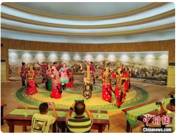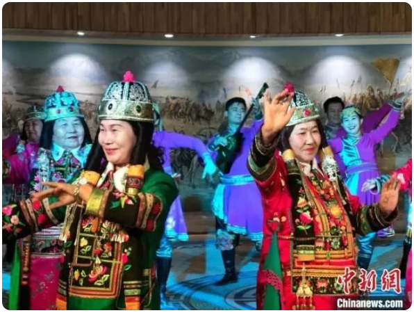 在博湖縣蒙古族非遺傳承保護中心,民間藝人們身穿華麗的民族服飾,伴隨著歡快的音樂,抖肩、彎腰、翻掌,表演薩吾爾登舞蹈。(中新網(wǎng)記者 王小軍 攝)