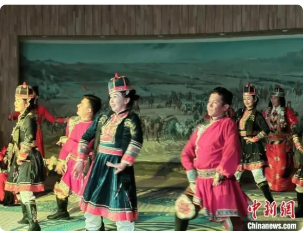 在博湖縣蒙古族非遺傳承保護中心,民間藝人們身穿華麗的民族服飾,伴隨著歡快的音樂,抖肩、彎腰、翻掌,表演薩吾爾登舞蹈,惟妙惟肖的舞姿、歡快強勁的節(jié)奏,為現(xiàn)場觀眾帶來了一場精彩絕倫的視覺盛宴。
