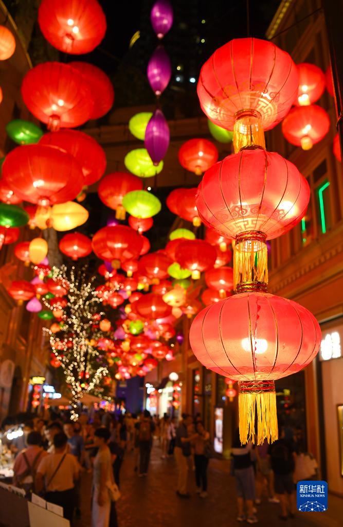 為迎接中秋佳節(jié)的到來,香港利東街舉辦“躍兔·迎月”戶外彩燈會。約200米長的林蔭大道懸掛起800多個五彩繽紛的中式燈籠,營造出喜慶的佳節(jié)氣氛。