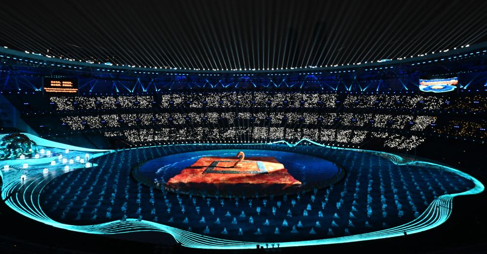 開(kāi)幕式實(shí)現(xiàn)了兩個(gè)首創(chuàng):3D雙威亞首次應(yīng)用于大型運(yùn)動(dòng)場(chǎng),首次采用“數(shù)實(shí)融合”的點(diǎn)火方式。