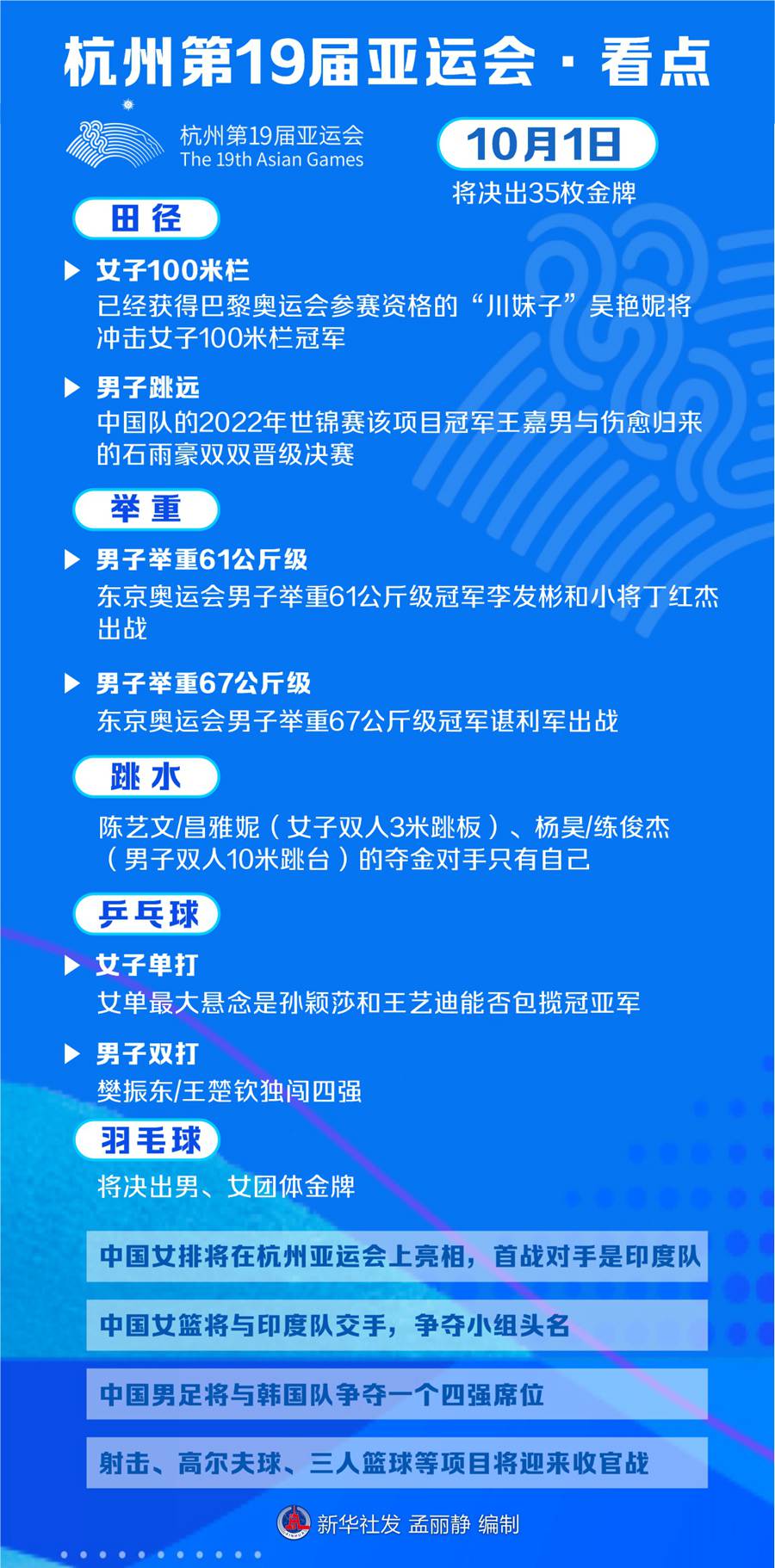 新華社杭州9月30日電(記者王恒志 張澤偉)杭州第19屆亞運會10月1日將決出35枚金牌,恰逢國慶,中國體育健兒將在多個項目上沖擊金牌。田徑賽場“顏值擔當”吳艷妮將挑戰(zhàn)自己的首個亞運會冠軍,中國女排將迎來首場比賽,跳水、舉重、乒乓球等幾支“夢之隊”也將繼續(xù)登場。