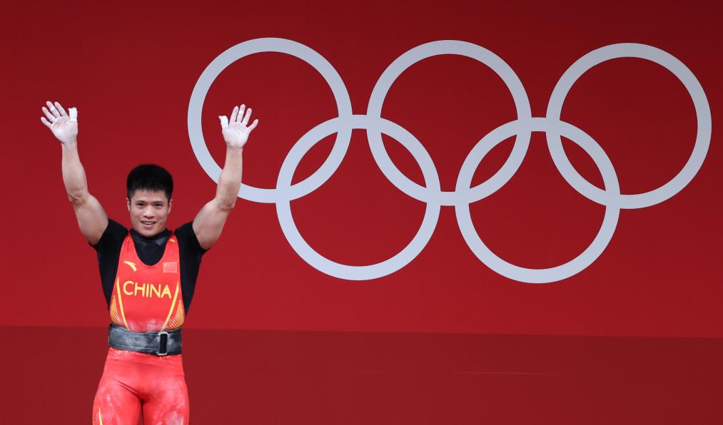 2021年7月25日,李發(fā)彬在東京奧運會舉重男子61公斤級決賽后慶祝奪冠。新華社記者 楊磊 攝