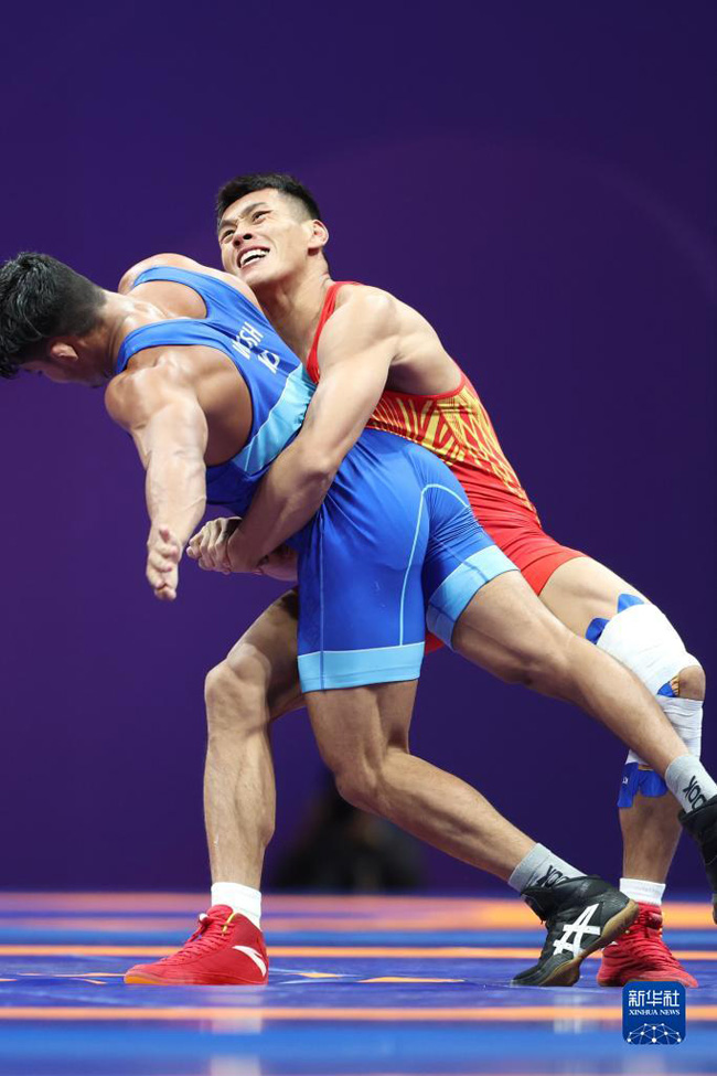 當日,在杭州亞運會摔跤項目男子古典式77公斤級四分之一決賽中,中國選手劉瑞戰(zhàn)勝印度選手維卡斯,晉級半決賽。