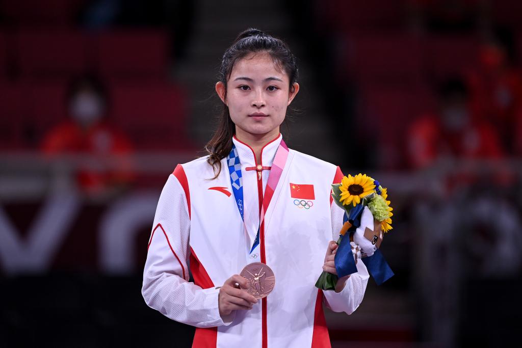 2021年8月7日,在東京奧運(yùn)會(huì)空手道女子組手61公斤以上級(jí)半決賽中,龔莉不敵阿塞拜疆選手伊琳娜,獲得季軍。圖為龔莉在頒獎(jiǎng)儀式上。新華社記者杜宇攝