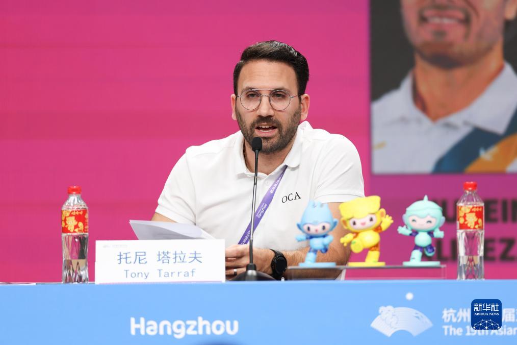 10月7日,亞奧理事會運動員發(fā)展部主管托尼·塔拉夫在新聞發(fā)布會現(xiàn)場發(fā)言。
