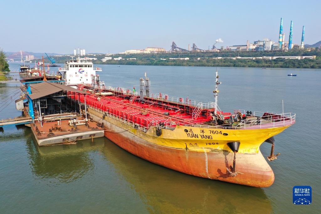 10月17日,在中國石化集團(tuán)重慶川維化工有限公司物流碼頭,出口的產(chǎn)品正在裝船(無人機(jī)照片)。