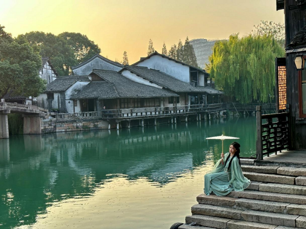 2022年11月11日,烏鎮(zhèn)西柵景區(qū),一名身著漢服的游客在拍照留念