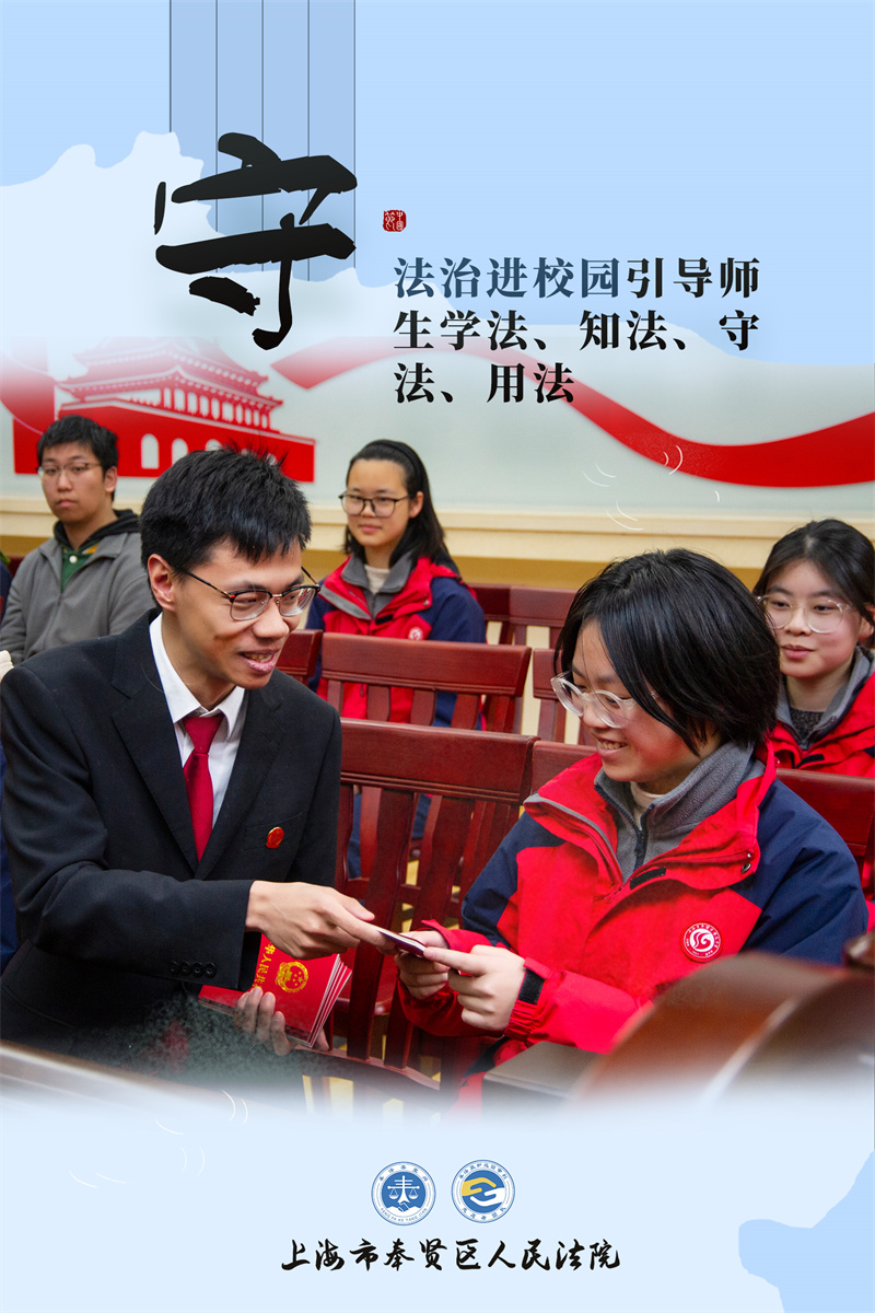 在上海市奉賢法院奉城法庭的法治進(jìn)校園教學(xué)點(diǎn)——奉城鎮(zhèn)曙光中學(xué)內(nèi),法官助理正在向高二的同學(xué)們分發(fā)憲法宣傳冊,并通過釋法析理引導(dǎo)同學(xué)們學(xué)法、知法、守法、用法,在心中播下法治的種子。