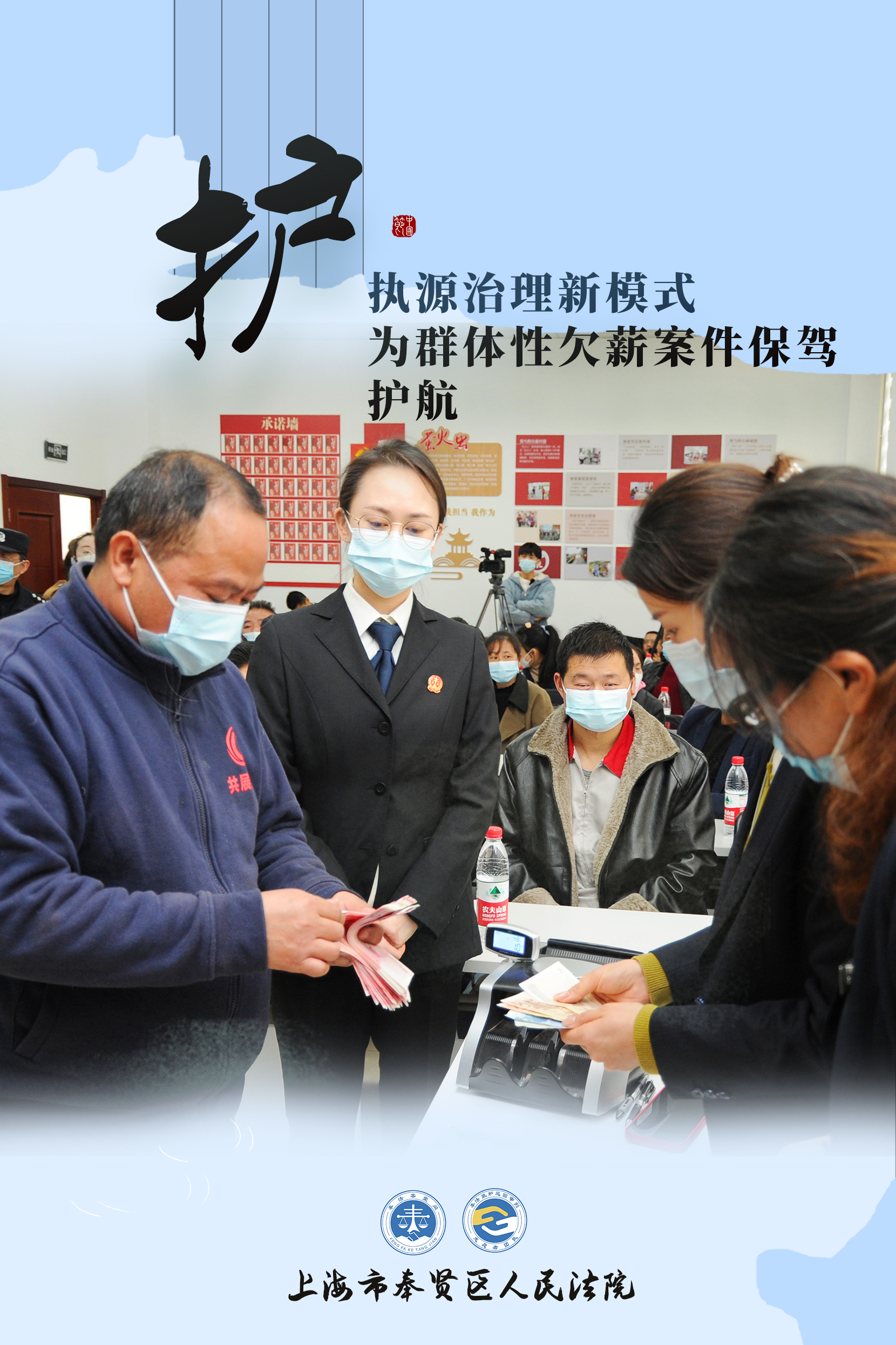 在“客堂間里護(hù)民生——奉賢法院工資發(fā)放活動”上,工人老徐終于拿到了自己半年多的工資。上海奉賢法院緊緊依靠地方黨委、緊緊依靠屬地政府、緊緊依靠當(dāng)事人理解與支持,探索形成了“黨委領(lǐng)導(dǎo)、多方支持、分工協(xié)作、形成合力”的執(zhí)源治理新模式,使得這批涉130余名工人、總金額達(dá)510余萬元的群體性欠薪糾紛得以妥善解決。