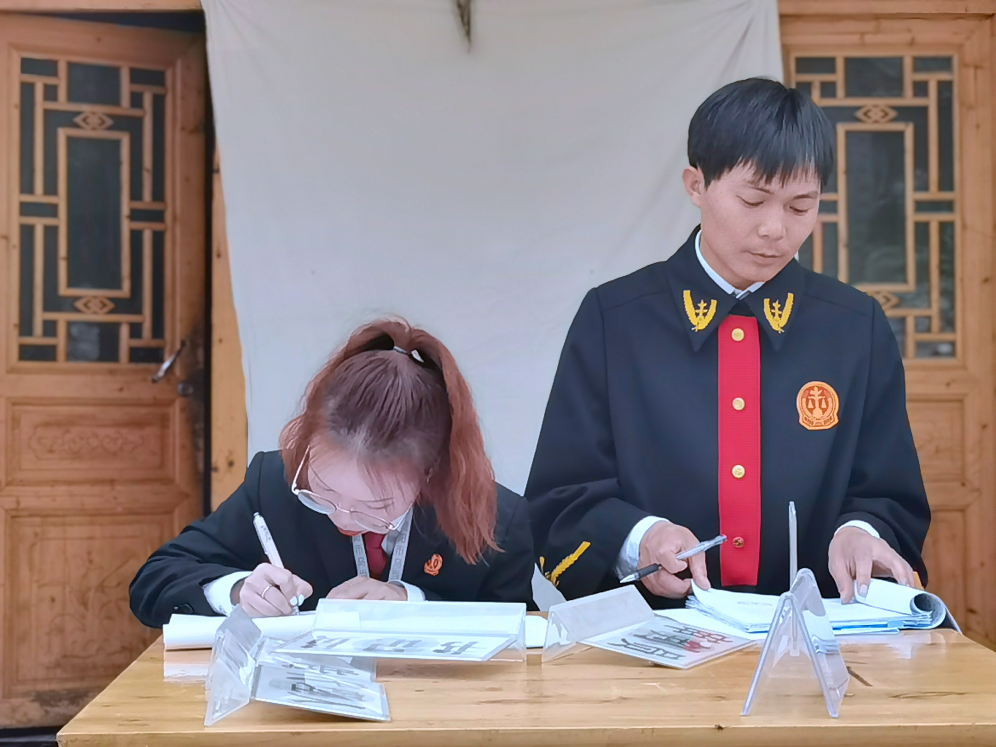 直到開庭前夕,承辦法官還在堅持做著被告的釋法析理工作,被告的態(tài)度從始至終無緩,仍表示不愿意到原告家參加庭審,法官對案件審理效果的擔(dān)憂直到所有訴訟參與人出現(xiàn)在了庭審現(xiàn)場方才散去。由此,國徽之下,法袍加身,飯桌一置,院壩圍坐,這件“家事”便在當(dāng)事人自家“飯桌”上攤開來說了,審理流程依序進行......