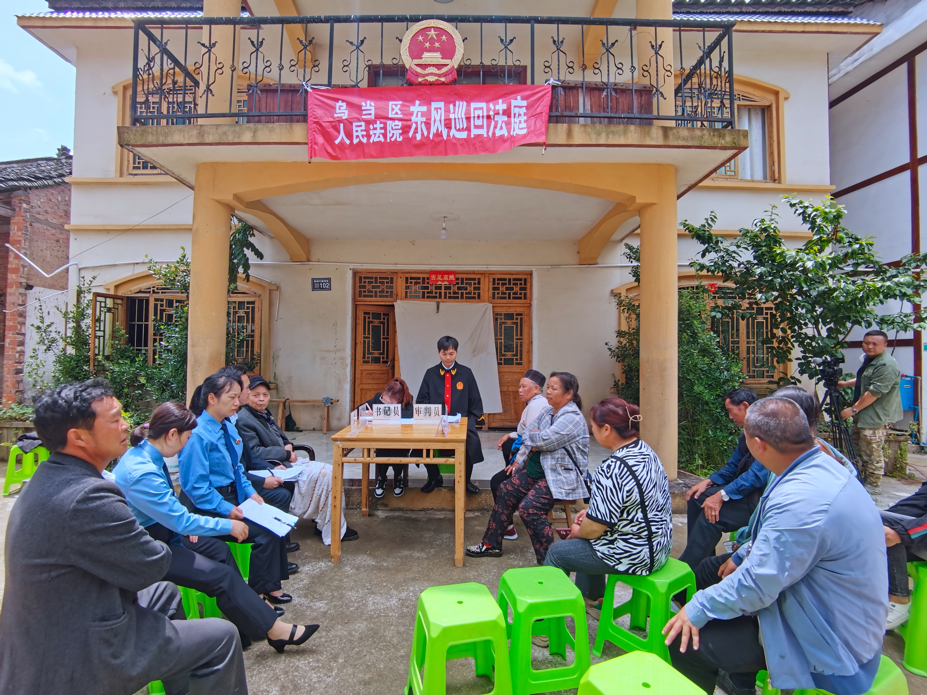 國徽掛欄,庭設(shè)院中,5月16日,烏當(dāng)區(qū)偏坡鄉(xiāng)偏坡村的一處農(nóng)家院里,烏當(dāng)區(qū)人民法院東風(fēng)法庭“就地取材”,在農(nóng)戶家的“飯桌”上進行了一場巡回審判,公開審理一起贍養(yǎng)費糾紛案件,烏當(dāng)區(qū)檢察院派員出庭支持起訴。案件的訴訟參與人及其親屬、烏當(dāng)區(qū)司法局偏坡鄉(xiāng)司法所、偏坡鄉(xiāng)平安辦等部門人員及部分村民一同參加了庭審。