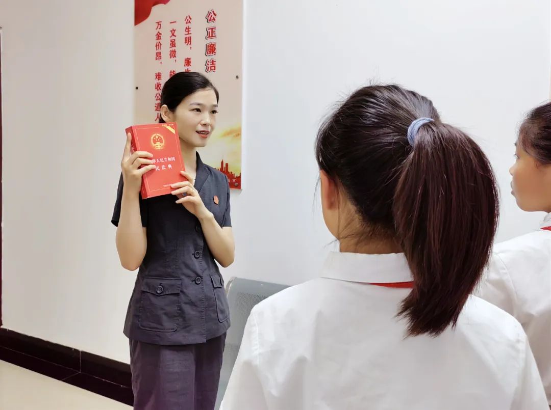 ▲鄭州市金水區(qū)人民法院舉辦開放日活動,為前來參觀的學生講解民法典。