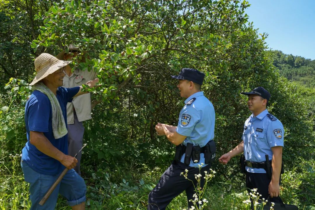 ▲信陽市公安局民警深入茶園,調(diào)查走訪轄區(qū)群眾,排查化解矛盾糾紛。