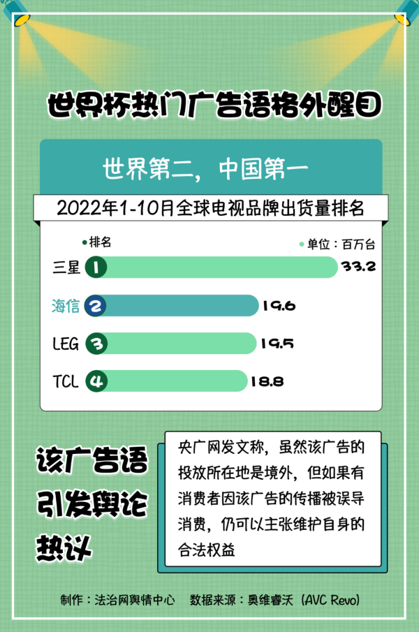 12.央廣網:海信“世界第二”廣告引發(fā)爭議:機構稱真實銷量是第四名 律師認為消費者可維權