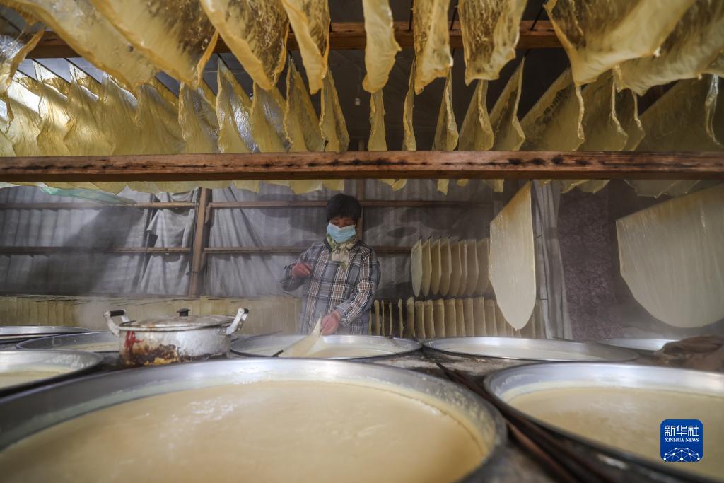 春節(jié)臨近,浙江省諸暨市安華鎮(zhèn)的傳統(tǒng)年貨——豆腐皮迎來銷售旺季。村民加緊制作豆腐皮,供應(yīng)節(jié)日市場。