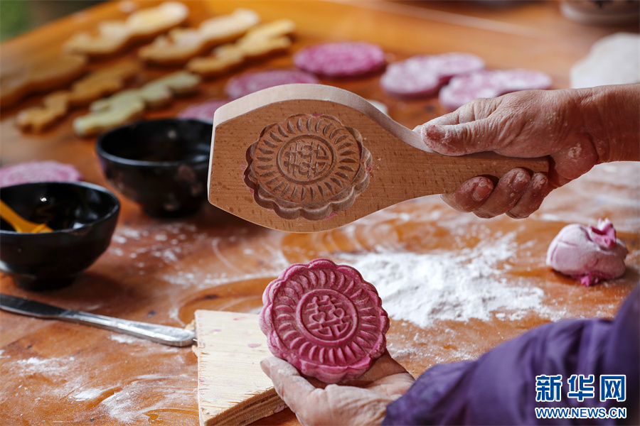 1月18日,在安徽省黃山市徽州區(qū)潛口鎮(zhèn)潛口村,村民用模具制作的多彩徽州米粿。