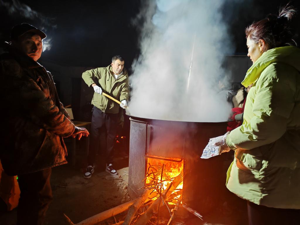 1月23日,志愿者正在喀拉蘇村安置點(diǎn)為受災(zāi)群眾烹飪美食。新華社記者茍立鋒 攝