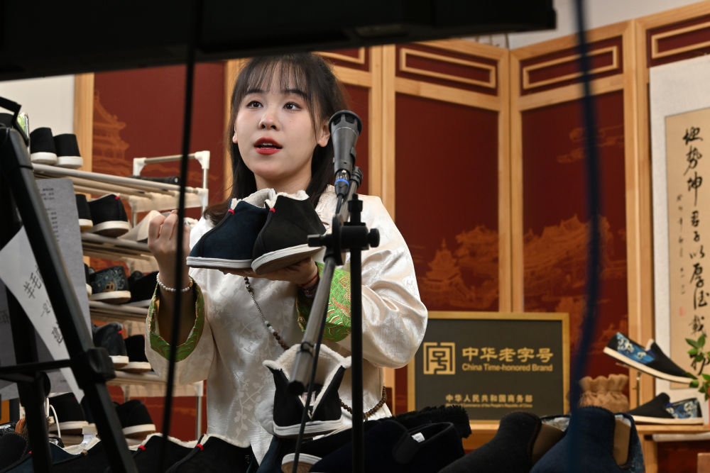 2023年12月8日,主播在老美華的直播基地內(nèi)帶貨。老美華始創(chuàng)于1911年,歷史上以“千層底”布鞋聞名,是享譽(yù)津門的“中華老字號”。新華社記者 李然 攝