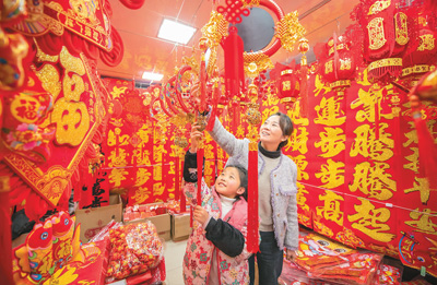 1月28日,江蘇省宿遷市宿豫區(qū)商貿(mào)城新年飾品賣場(chǎng)紅紅火火,年味十足;市民忙著挑選春節(jié)飾品,準(zhǔn)備過年。徐江海攝(人民圖片)