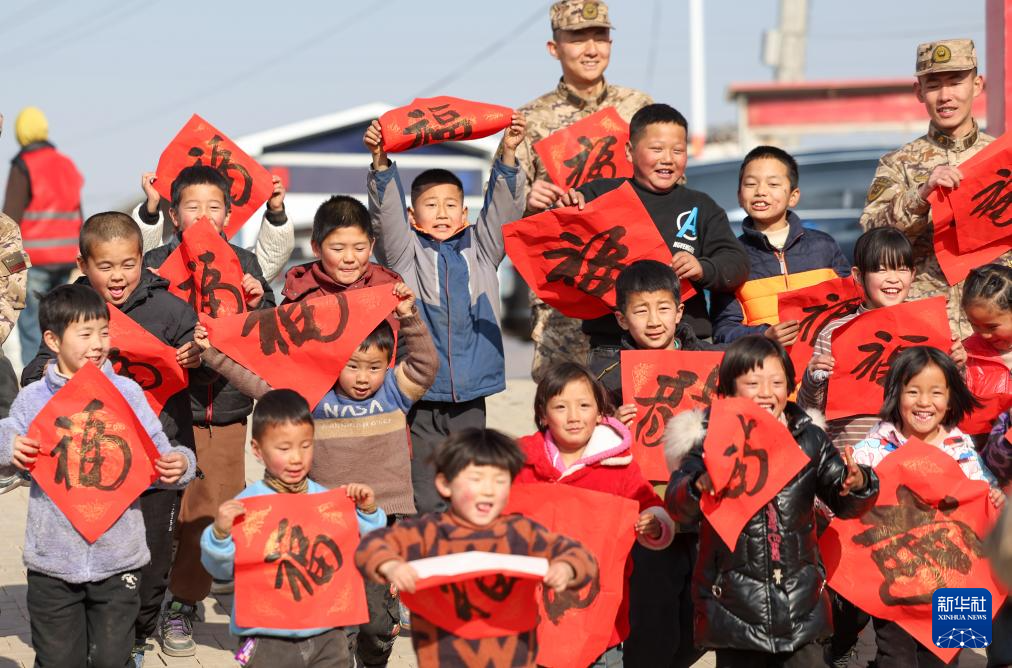 在甘肅省積石山縣陽(yáng)洼村,武警甘肅總隊(duì)臨夏支隊(duì)官兵和小朋友一起展示“?!弊郑?月30日攝)。新華社發(fā)(侯崇慧 攝)